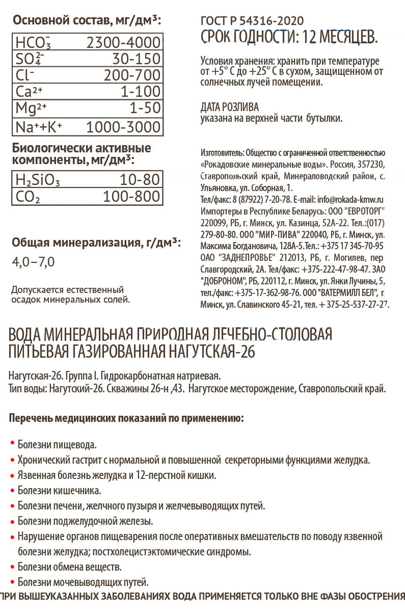 Вода минеральная природная лечебно-столовая питьевая газированная ТМ «Рокада» добывается из скважин № 26, 43 Нагутского месторождения минеральных вод, расположенных в экологически чистом регионе России в Ставропольском крае на территории Кавказских Минеральных Вод. Вода имеет уникальный природный состав минеральных веществ. По своим свойствам минеральная вода – гидрокарбонатная натриевая с повышенным содержанием кремниевой кислоты. Кремний называют минералом молодости. Поступая в организм, элемент укрепляет иммунитет и препятствует старению, предупреждает болезнь Альцгеймера, укрепляет сосуды. Минеральная вода ТМ «Рокада» имеет правильный природный показатель PH 6,9. Такую воду называют нейтральной. А употребление такой воды на ежедневной основе оказывает благоприятное влияние на поддержание оптимального кислотно-щелочного баланса в организме человека.