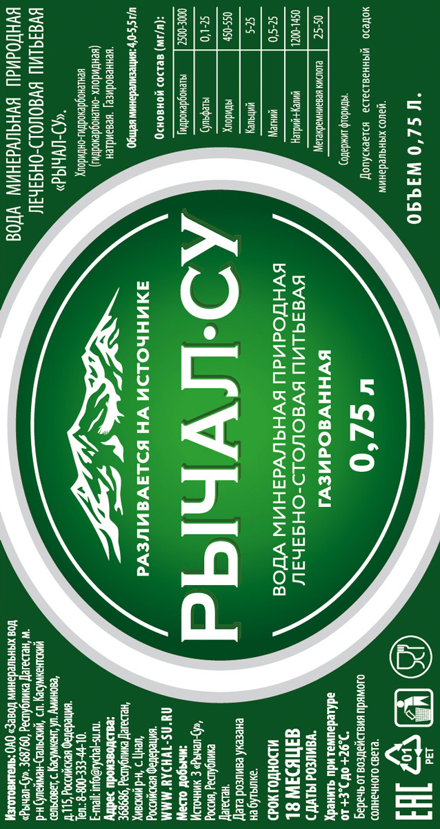 В отличии от других минеральных вод, добываемых путем бурения скважин, вода «РЫЧАЛ-СУ» самопроизвольно вытекает из горных песчано-скальных пород в виде источника в экологически чистом горном районе южного Дагестана. Среди местных жителей ходит поверье, согласно которому эта вода способна даровать слабым — силы, а сильным — духовный мир и спокойствие. Именно «РЫЧАЛ-СУ» богата йодом и другими необходимыми организму человека микроэлементами. Оказывает комплексное благотворное воздействие на организм человека. Из более двухсот источников минеральных вод Кавказа лечебно-столовая природная минеральная вода «РЫЧАЛ-СУ» входит в десятку вод со сложным химическим составом. Очень приятна на вкус, не слишком соленая, не сильно газированная. Прекрасное средство для утоления жажды!
