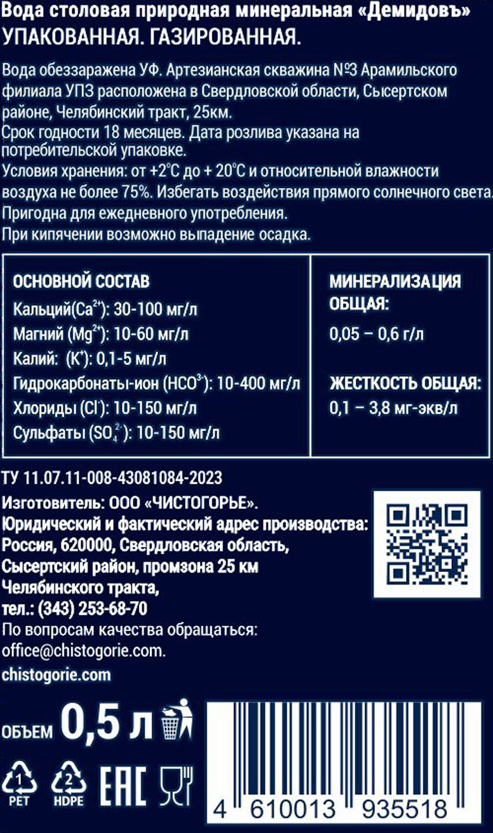 Вода столовая природная минеральная «Демидовъ» газированная. Добыта из артезианской скважины Nº 3. Содержит кальций, магний, калий, гидрокарбонаты, сульфаты и хлориды.
