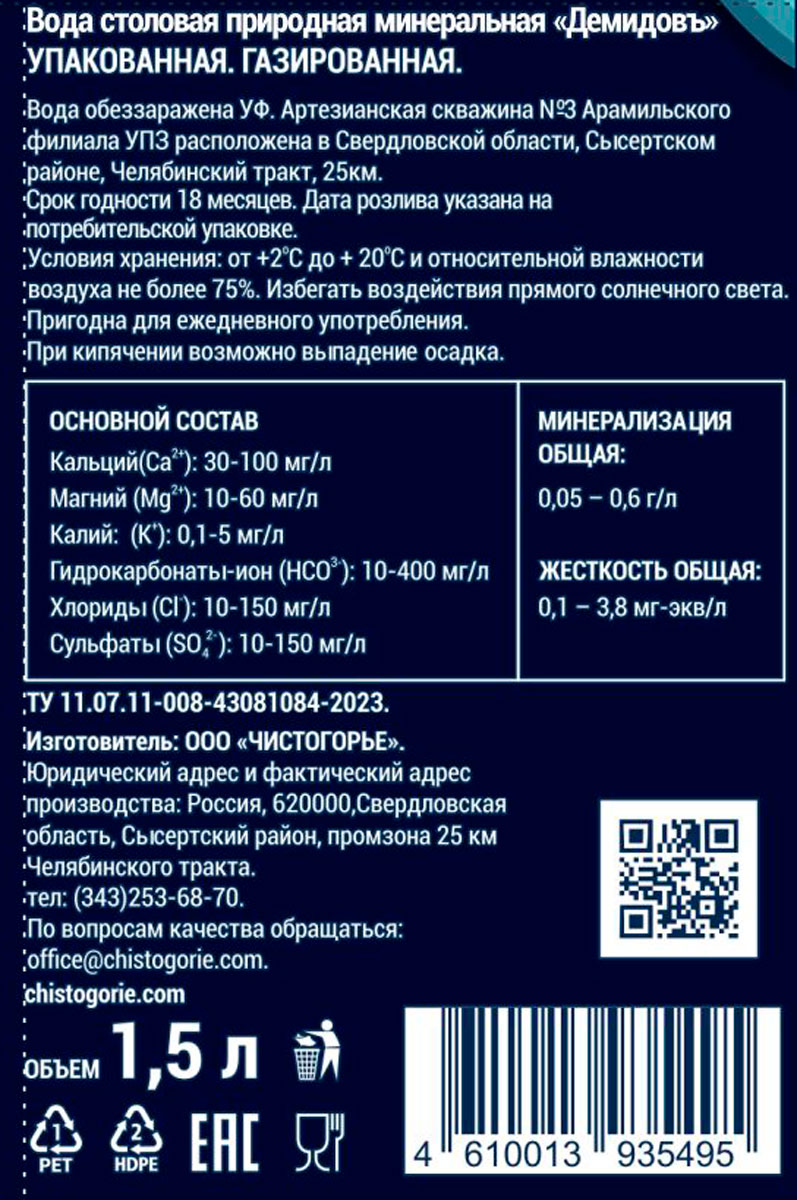 Вода столовая природная минеральная «Демидовъ» газированная. Добыта из артезианской скважины № 3. Содержит кальций, магний, калий, гидрокарбонаты, сульфаты и хлориды.