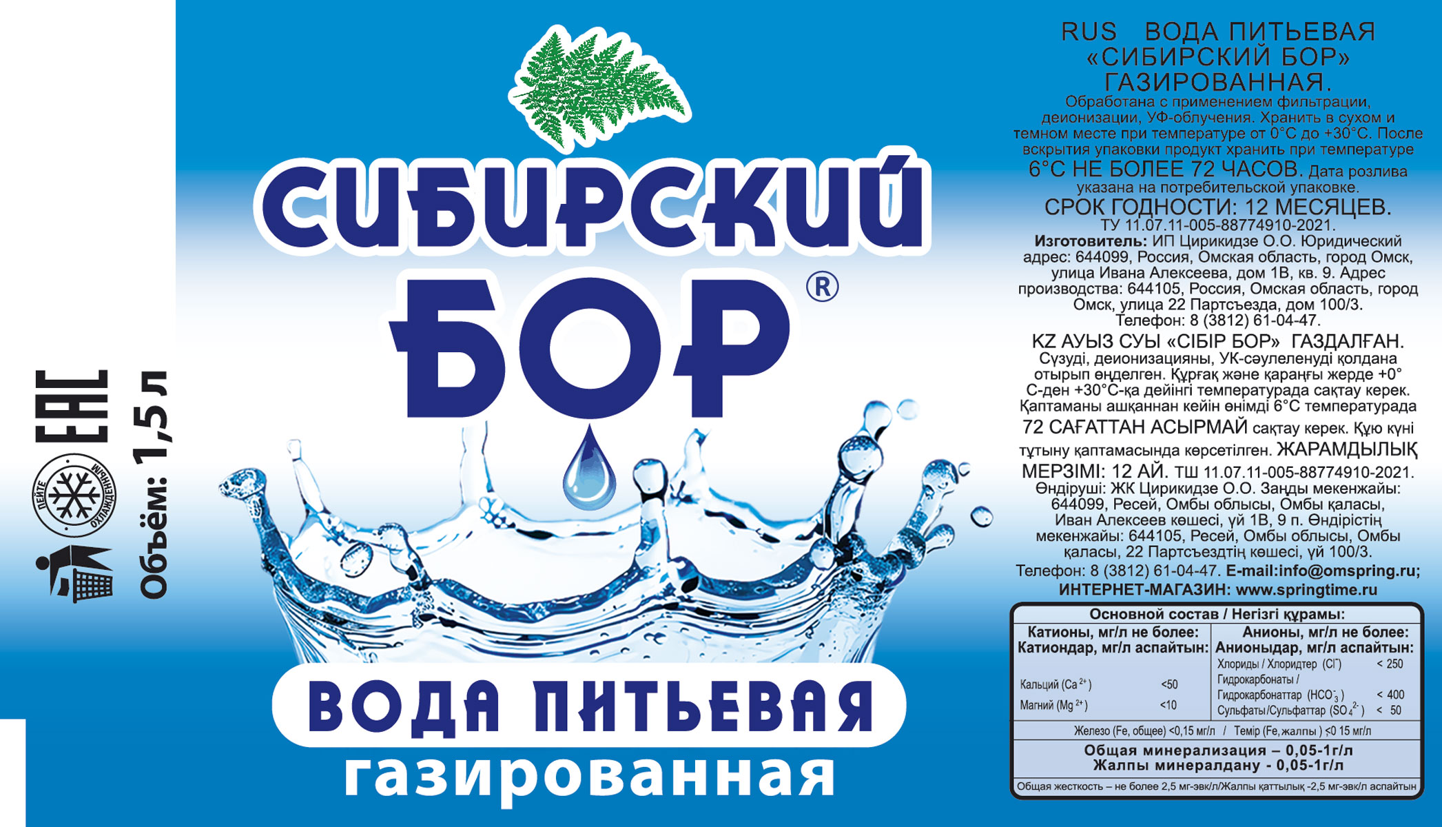 Газированная питьевая вода «Сибирский Бор» обработана с применением фильтрации, деионизации, УФ-облучения.
