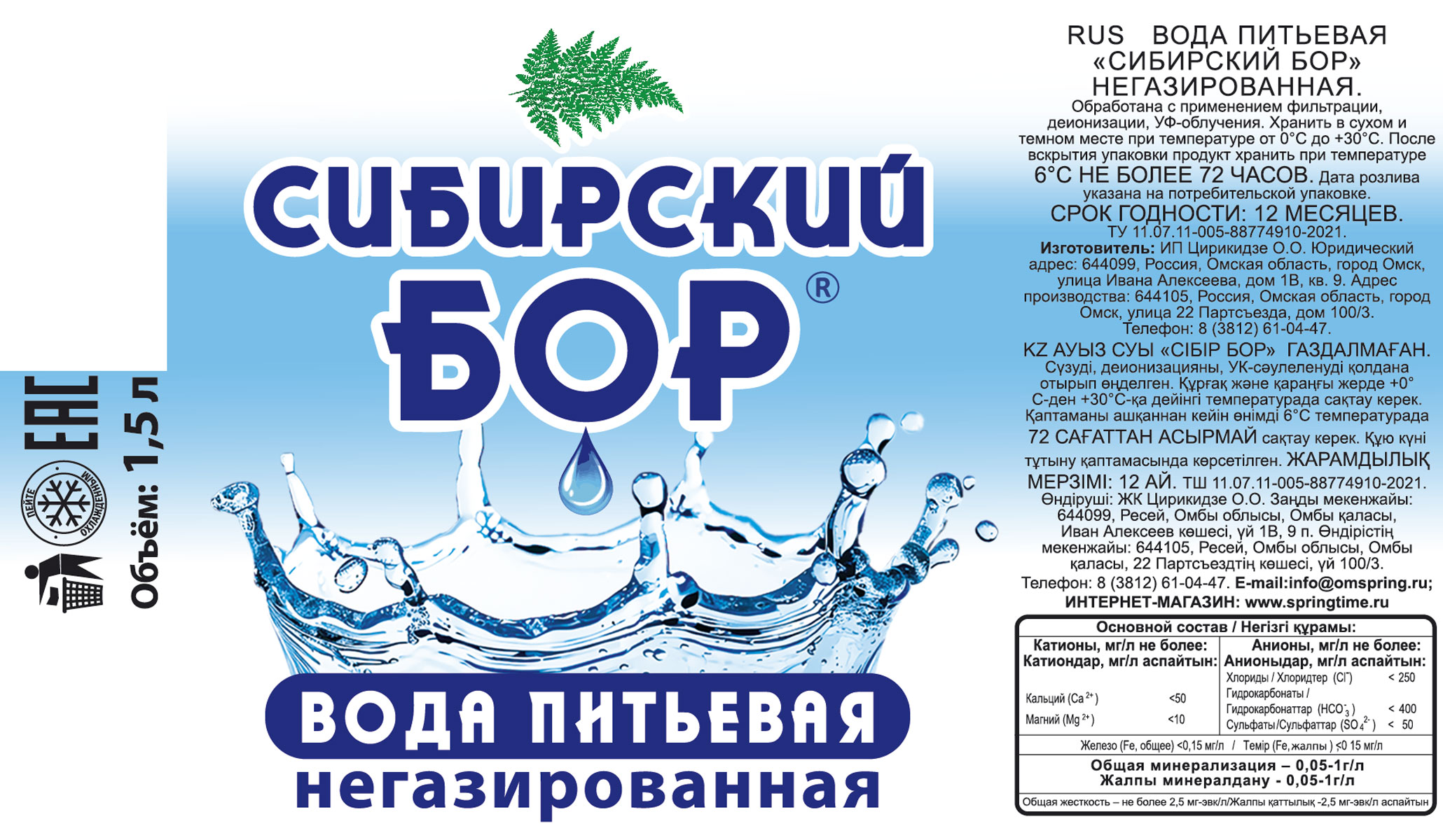 Негазированная питьевая вода «Сибирский Бор» обработана с применением фильтрации, деионизации, УФ-облучения.