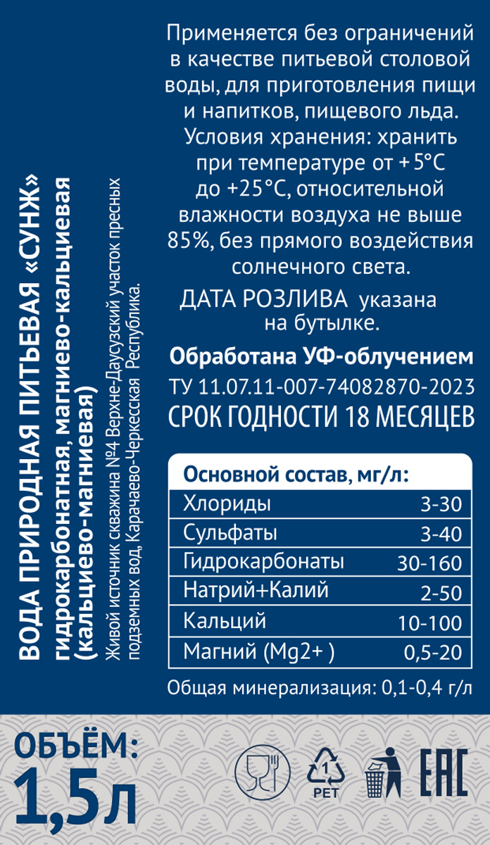 Газированная природная ледниковая вода — это основная достопримечательность экологически чистого региона Карачаево-Черкесской республики, находящегося в окружении известных заповедников и каскадов гор. Именно здесь в верхних участках ледников на высоте 1100 метров над уровнем моря зародился живой источник воды «СУНЖ», что в переводе с тюркского, обозначает «ледниковая вода». Добывается вода в официально зарегистрированной скважине № 4 Верхне-Даусузского участка. Эта вода содержит необходимые для человеческого организма микроэлементы: натрий, кальций, магний, а также минеральные соли. Ледниковая вода оказывает общеукрепляющее действие, хорошо стимулирует иммунную систему организма, утоляет жажду. Является источником психологического здоровья и долголетия.