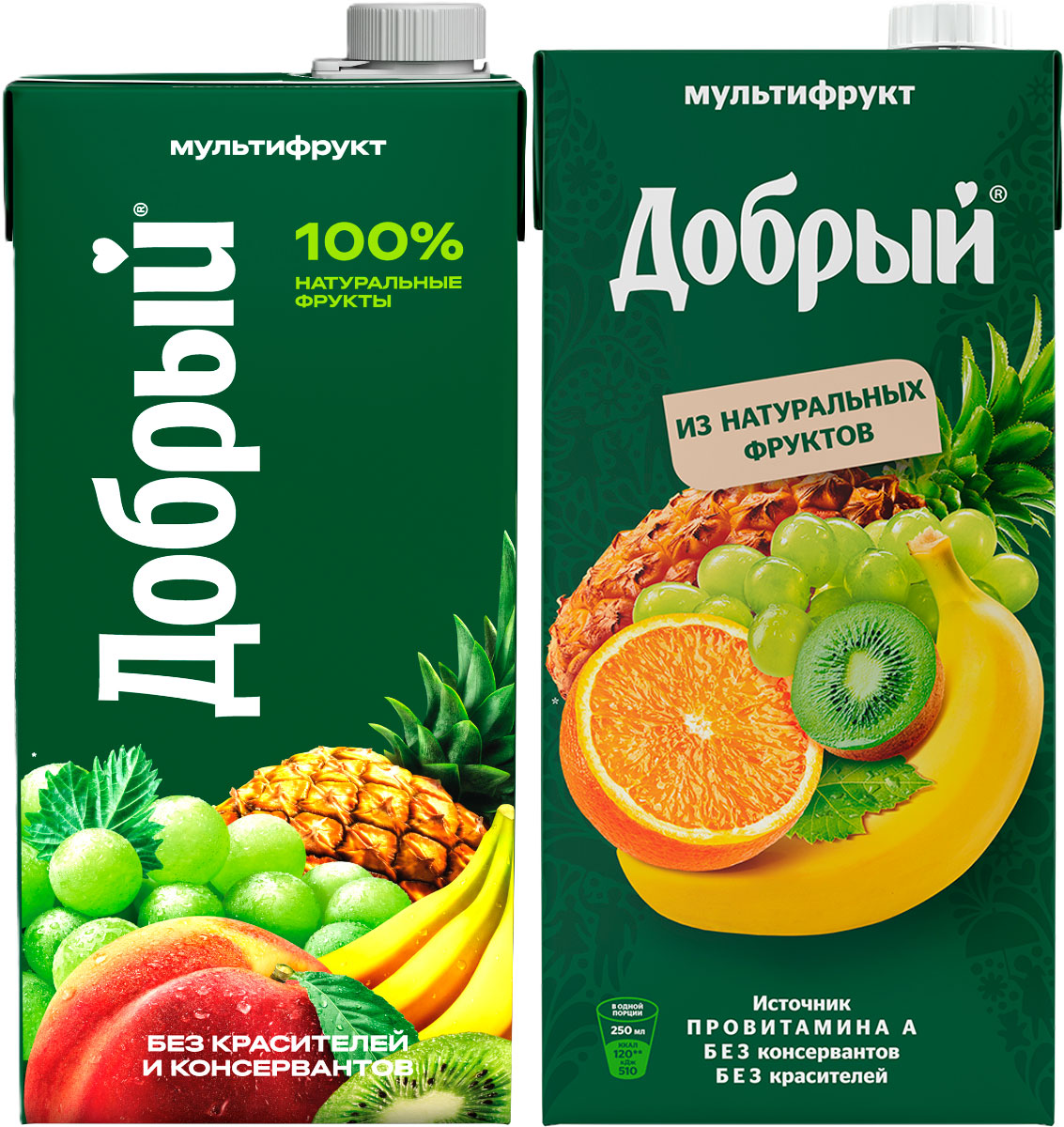 «Добрый Мультифрукт» – нектар без консервантов и красителей в удобной упаковке для большой семьи или компании. Обладает мягким, сбалансированным вкусом и содержит в дном стакане 50% суточной нормы провитамина А, витамин С и антиоксиданты (рекомендованной для питания детей 3-х лет в соответствии с Методическими рекомендациями МР 2.3.1.2432-08).