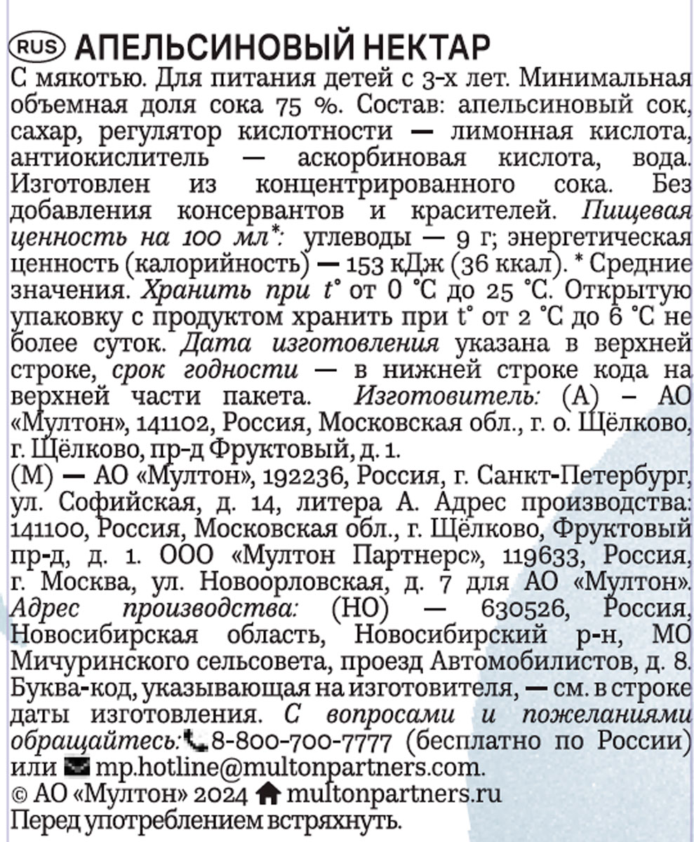 не могу оставить комментарий на грейпфрутовый сок, оставлю на этот, думаю далеко не ушёл. Какой раньше это был вкусный сок с мякотью и что сейчас?! нектар!!! а не сок! На пол пачке расписано о производителе, да так, что и не поймёшь где производитель то в итоге, а состава то нет совсем ни с одного бока, ни с другого, ни с третьего, ни с четвертого, ни сверху, ни снизу, а че так можно было ?!