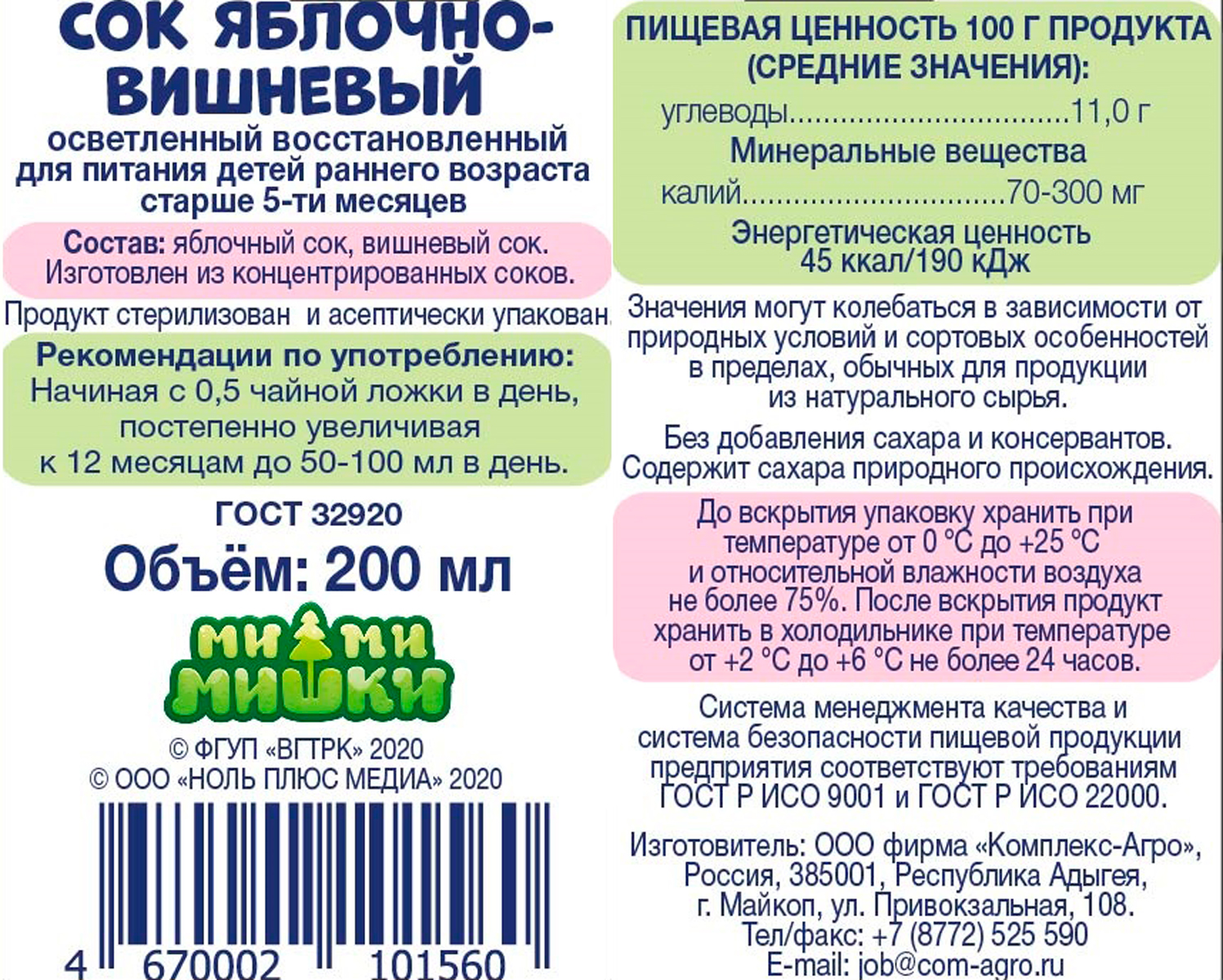 Сок из яблока и вишни «Ми-ми-мишки» с любимой героиней Соней из одноименного мультсериала. В его составе только 100% натуральные ингредиенты. Содержит сахара природного (естественного) происхождения. Для питания детей старше 5 месяцев.