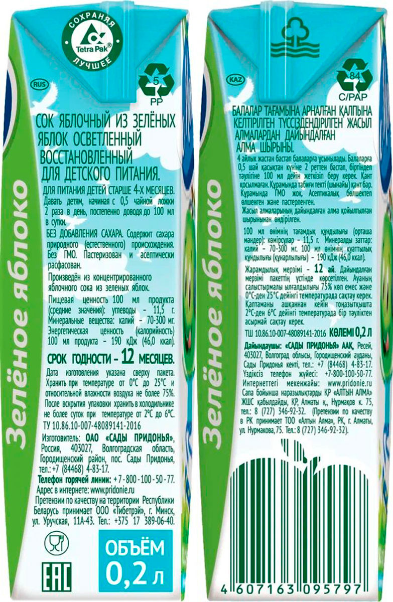 Сок производится из зеленых сортов донских яблок. Северный Синап, Избранница, Курский Золотой, Синап Орловский, собранных в плодовом хозяйстве «Сады Придонья». Он обладает самыми низкими аллергенными свойствами, поэтому подходит всем без исключения и имеет приятный освежающий кисло-сладкий вкус.