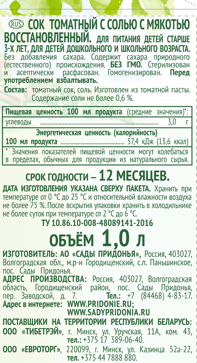 Сок Сады Придонья томатный с солью с мякотью 1 л