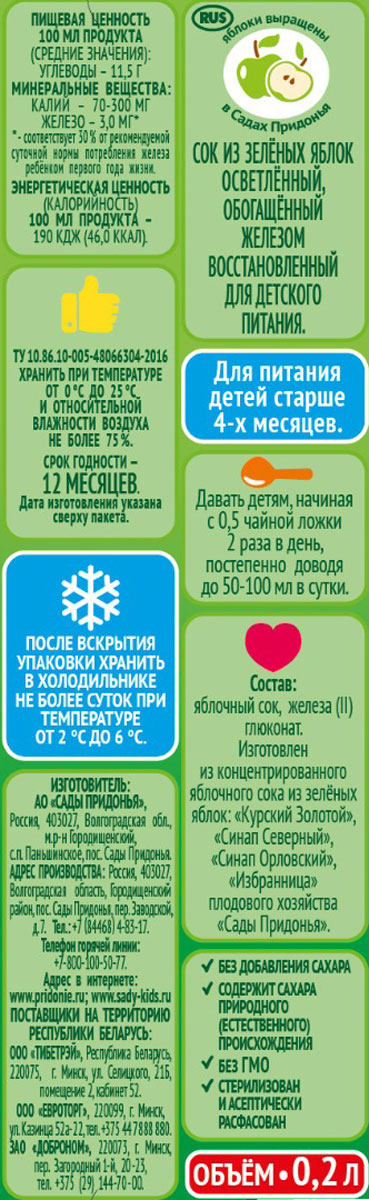 Яркое утро начинается с улыбки, и именно такую приносит вашему ребёнку сок «Сады Придонья» из зелёных яблок. Напиток дарит свежесть и энергию, словно солнце ранним утром. Особый секрет напитка — дополнительное содержание железа, которое стимулирует формирование крепкого иммунитета и защищает от усталости. Легкая форма подачи в виде прозрачного сока упрощает восприятие детьми и снижает нагрузку на ЖКТ. Выбор родителей, желающих подарить ребёнку начало дня с удовольствием и пользой!