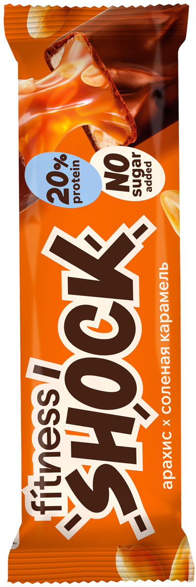 Протеиновый батончик Fitness Shock с цельным арахисом в солёной карамели, покрытый шоколадной глазурью. Shock-сочетание вкуса и пользы!