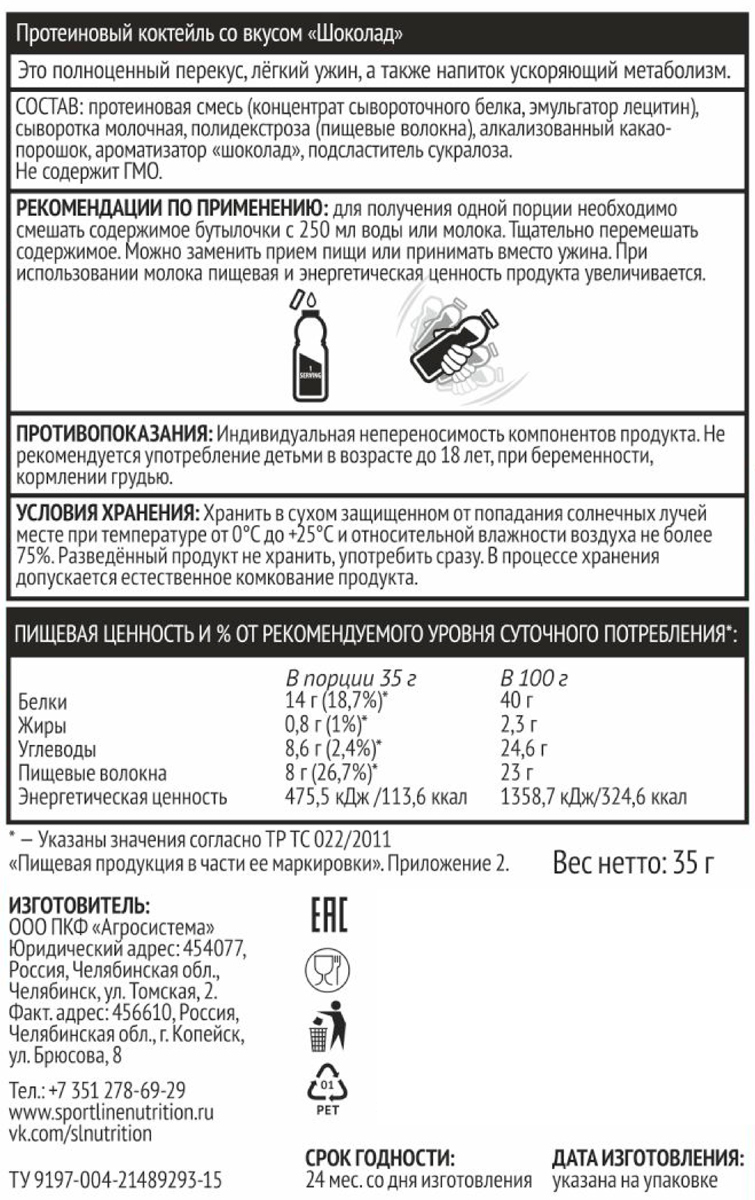 Протеин — это сухой сывороточный белок, состоящий из множества аминокислот, участвующих во всех процессах жизнедеятельности нашего организма. В первую очередь протеин необходим для людей, ведущих активный образ жизни и придерживающихся определенного плана питания с целью контроля веса, похудения, набора массы, увеличения выносливости и силовых показателей. С помощью протеиновых коктейлей можно увеличить ежедневное потребление белка. Наш организм постоянно нуждается в белке, так как он принимает участие в укреплении иммунной системы, передаче импульсов по всему телу, росте и восстановлении клеток и тканей. И все же одними из основных функций белка являются наращивание мышечной массы, улучшение мышечного восстановления и продление сытости. Коктейль необходимо приготовить, добавив в бутылочку с сухим продуктом воды или молока (примерно 200–250 мл) и тщательно встряхнув. Так вы получите вкусный полноценный перекус, лёгкий ужин, а также напиток, ускоряющий метаболизм. Также рекомендуется и для пожилых людей, так как протеин легкоусвояем. Белки быстро расщепляются, не нагружают поджелудочную железу, всасываются в полной мере.