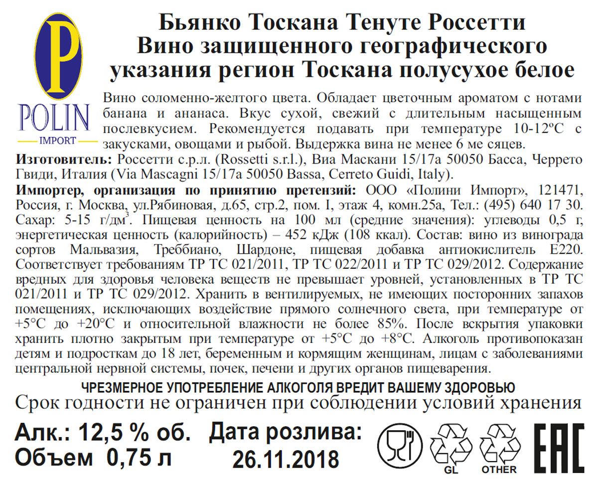 Вино Тенуте Россетти Бьянко Тоскана белое полусухое 0.75
