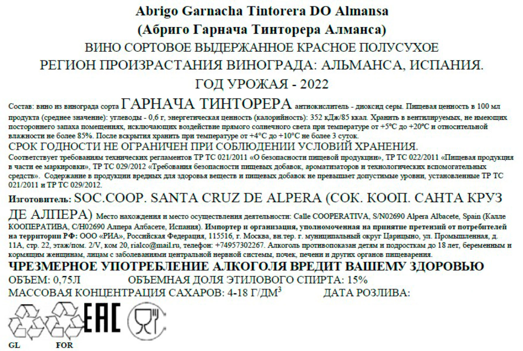 Вино Абриго Гарнача Тинторера Алманса красное полусухое 0,75 л