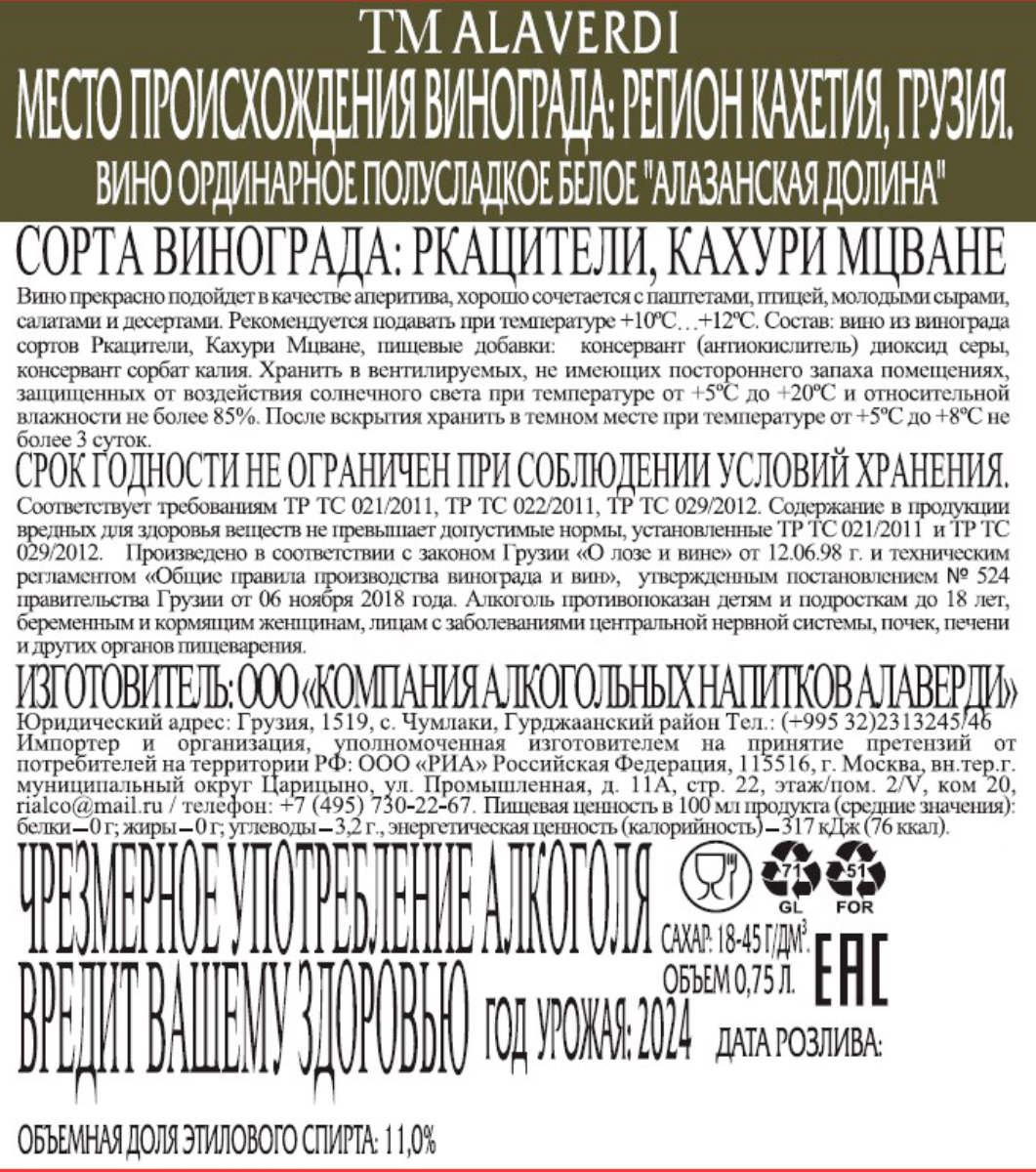 Вино Alaverdi Алазанская Долина ординарное белое полусладкое