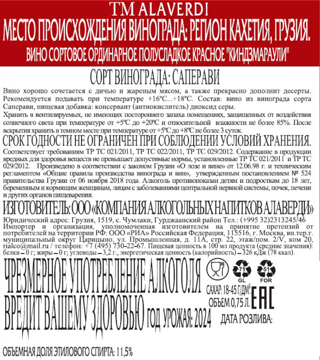 Вино Alaverdi Киндзмараули красное полусладкое 0,75 л