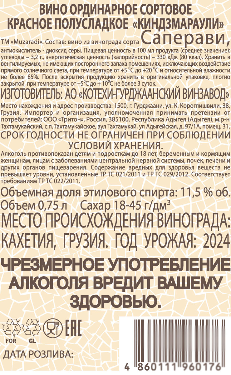 Вино Музаради Алазанская Долина красное полусладкое 0,75 л