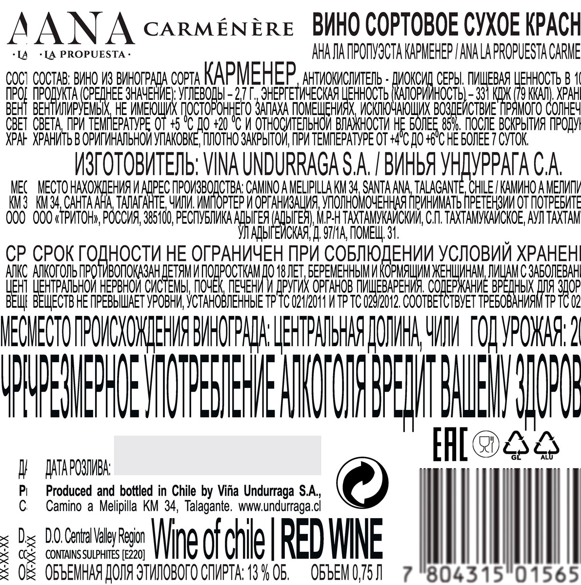 Вино Ана ла Пропуэста красное сухое 0,75 л