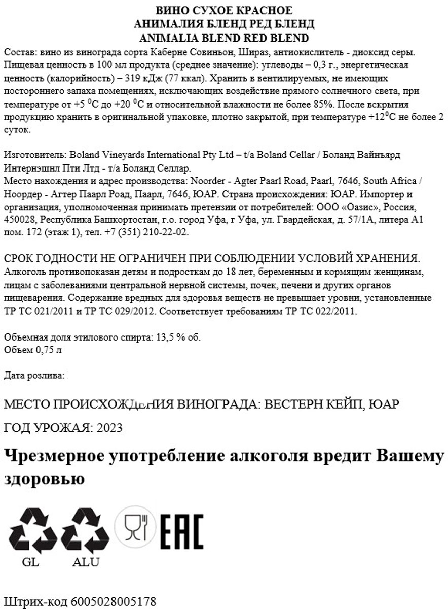 Вино Анималия Бленд Ред Бленд красное сухое 0,75 л