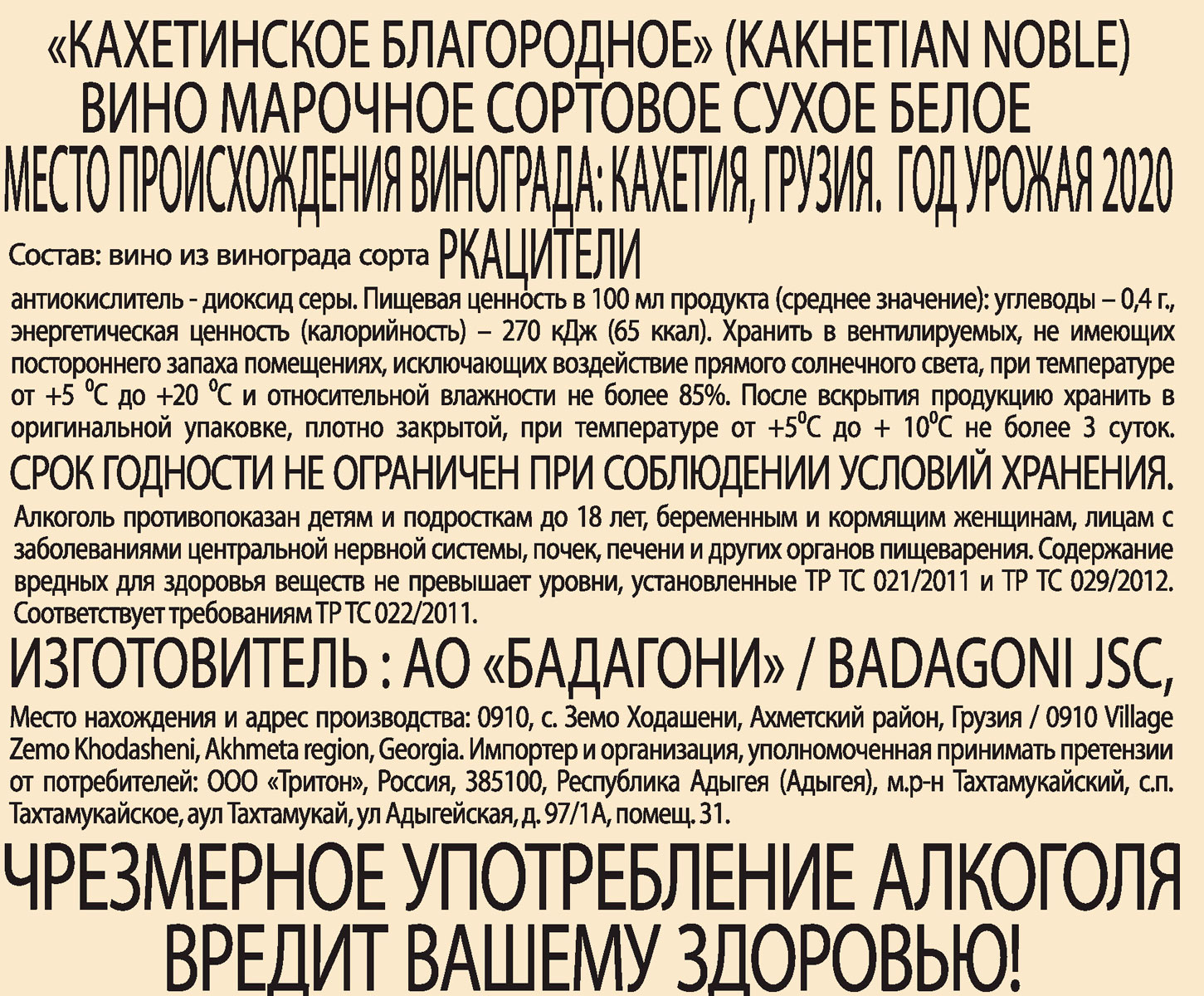 Вино Бадагони Кахетиан Нобл белое сухое 0,75 л