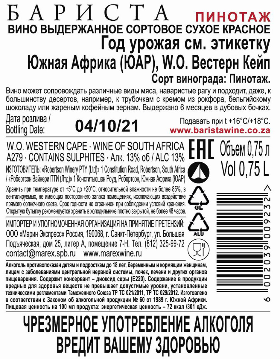 Вино Бариста Пинотаж красное сухое 0,75 л