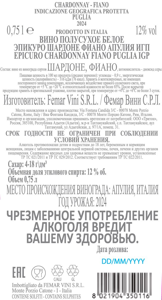 Вино Эпикуро Шардоне Фиано Апулия белое полусухое 0,75 л