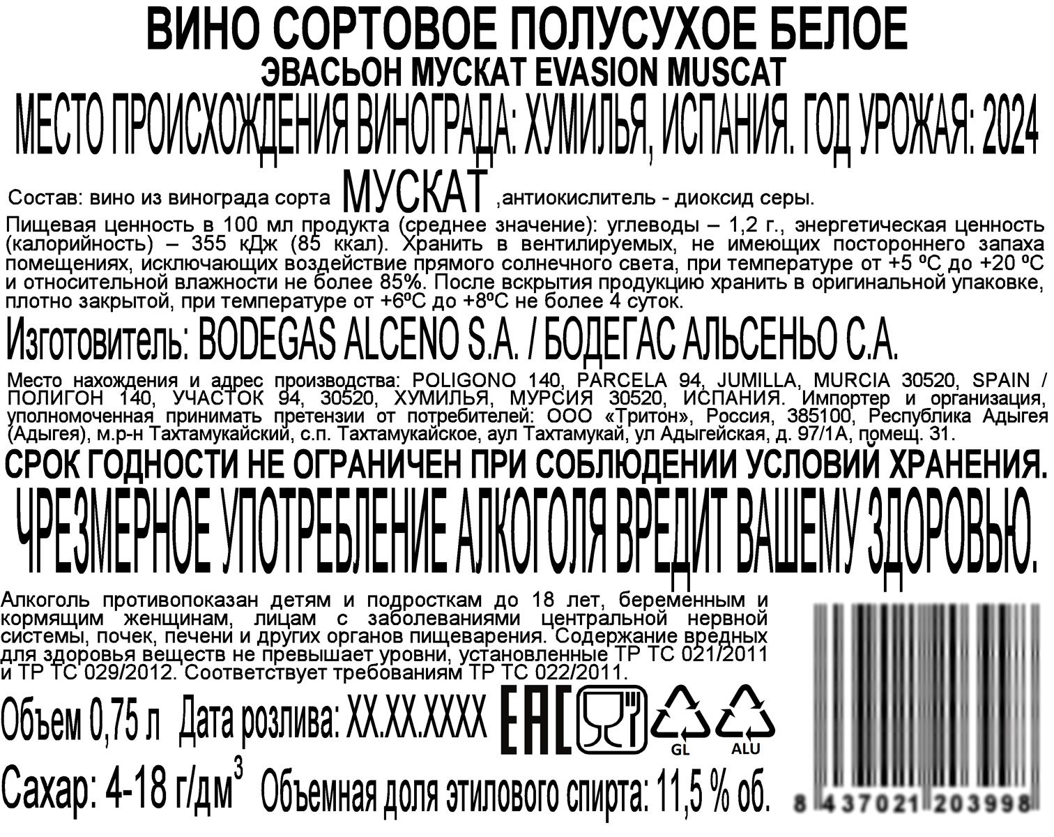 Вино Эвасьон Мускат белое полусухое 0,75 л