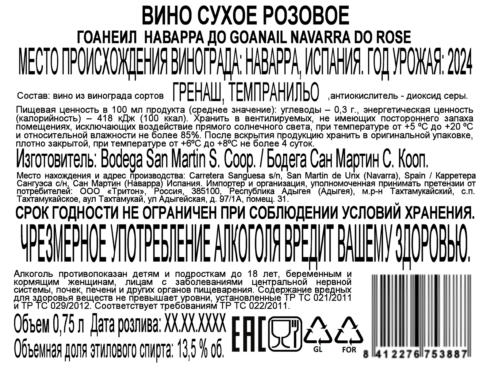 Вино Гоанеил Наварра розовое сухое 0,75 л