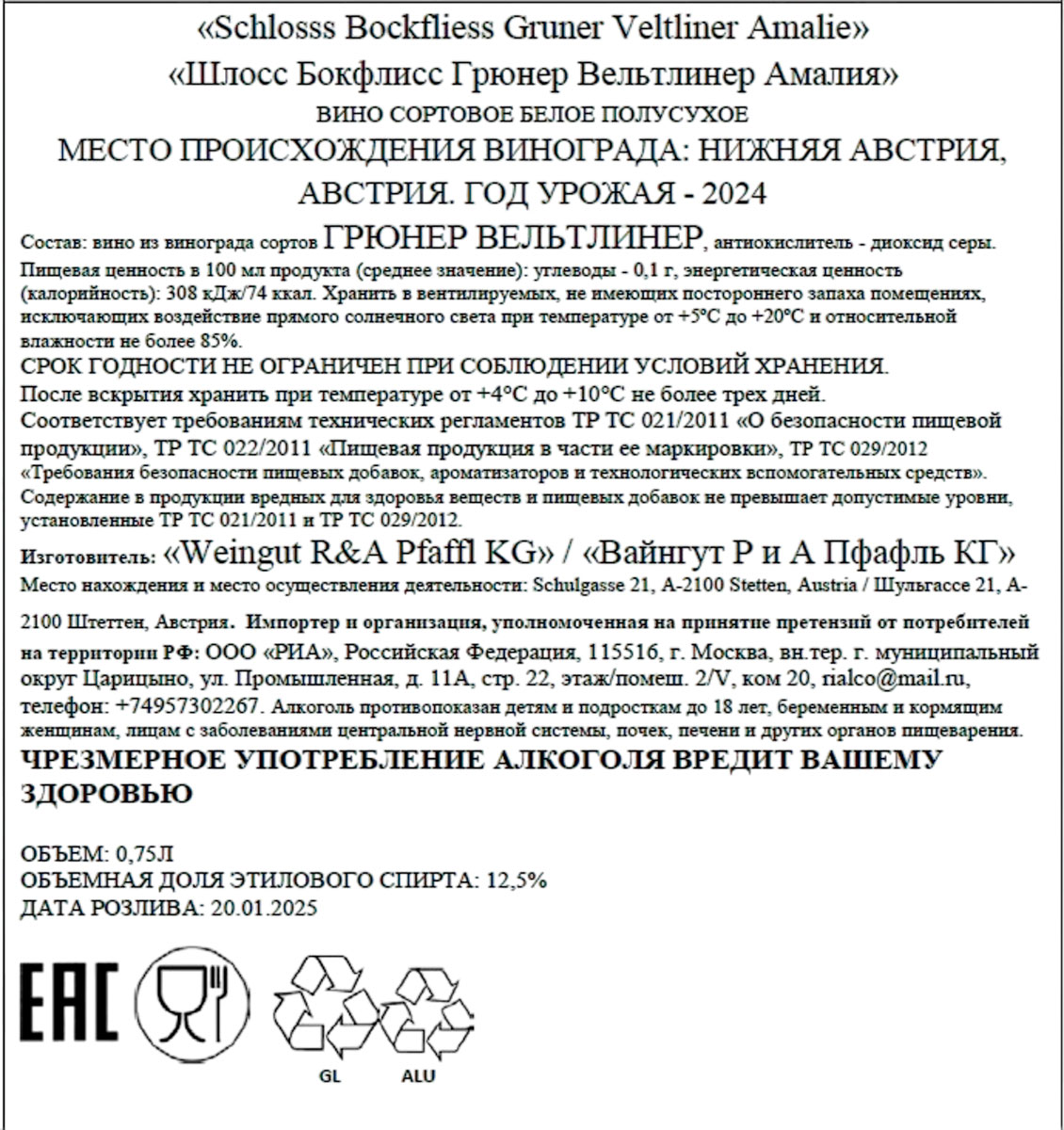 Вино Грюнер Вельтлинер Амали белое полусухое 0,75 л