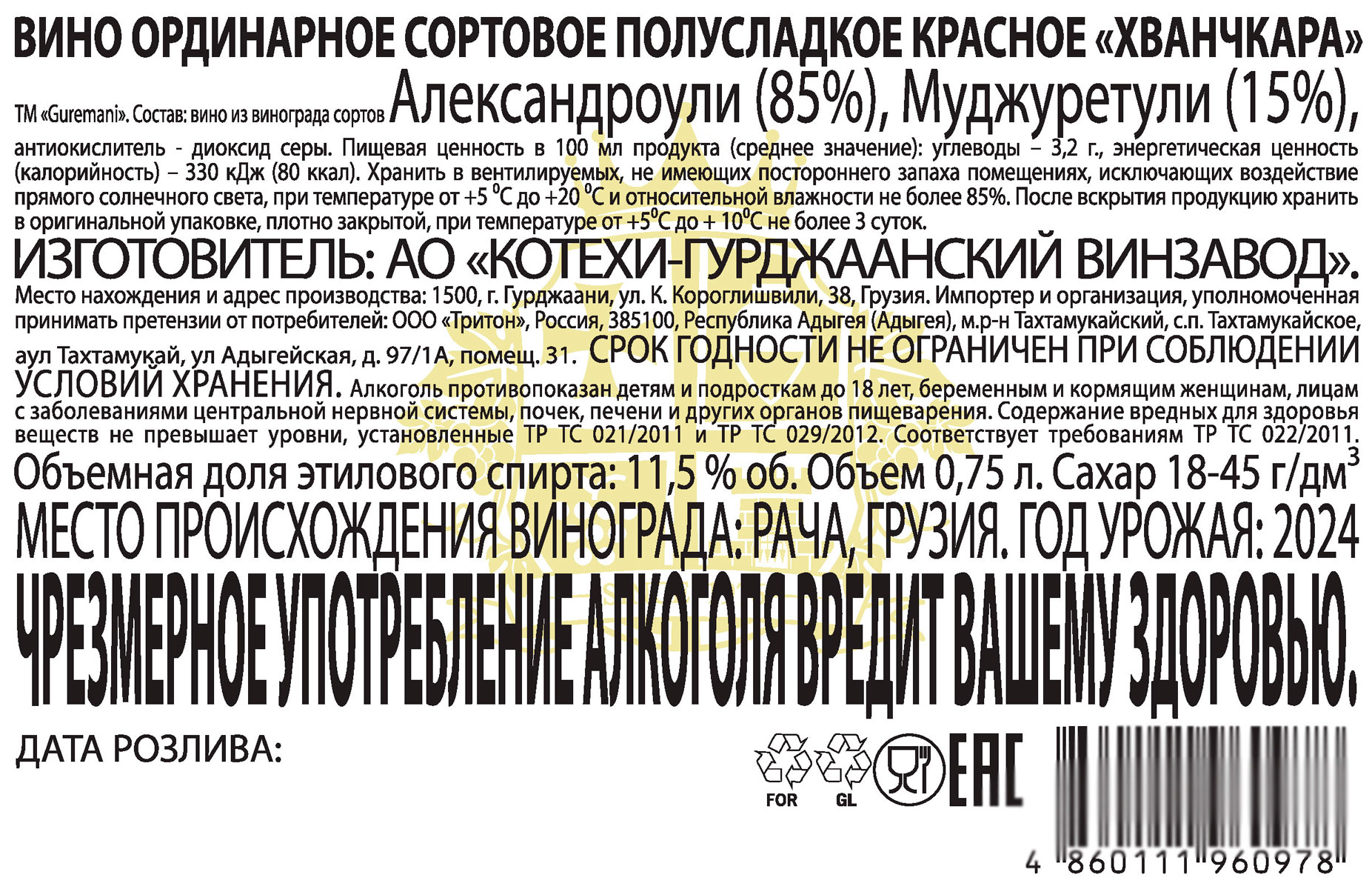 Как любитель грузинских вин, со всей ответственностью заявляю - это не Хванчкара и даже не Киндзмараули! Уровень данного вина - Алазанская долина, а то и ниже! Понимаю, что за эти деньги чудес не бывает, но называть прославленным напитком это вино язык не поворачивается! Бутылку допить не смогли! Сплошное разочарование! Не рекомендую к покупке!