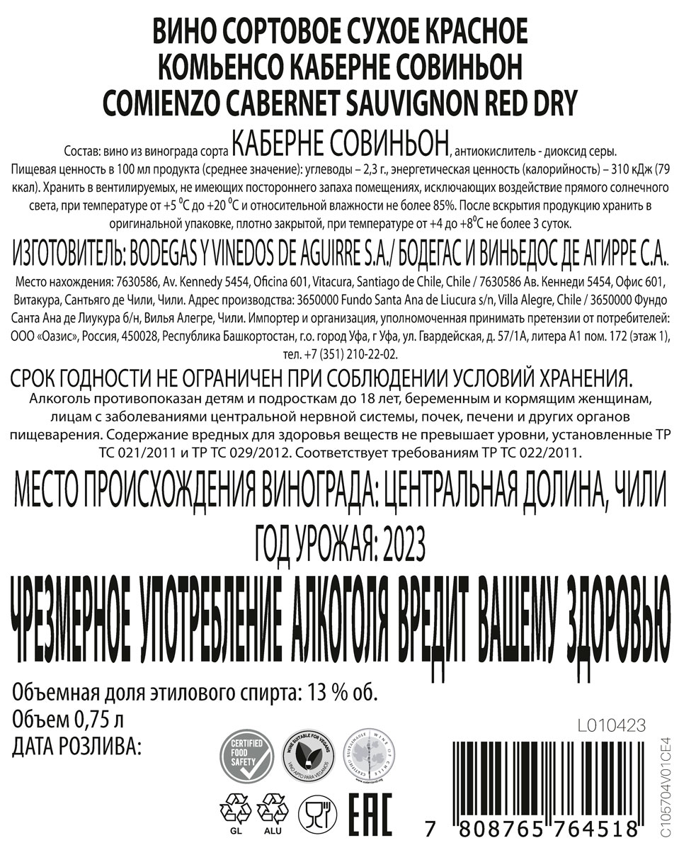 Вино Комьенсо Каберне Совиньон красное сухое 0,75 л