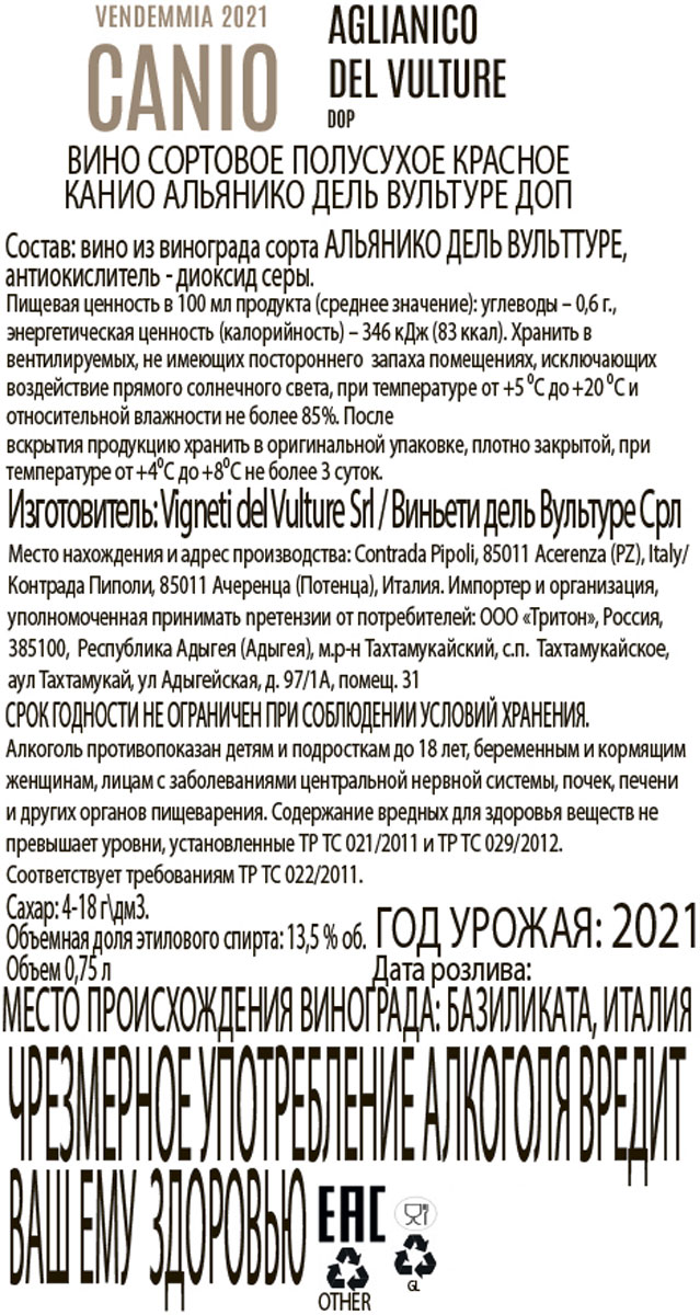 Вино Канио Альянико дель Вультуре красное полусухое 0,75 л
