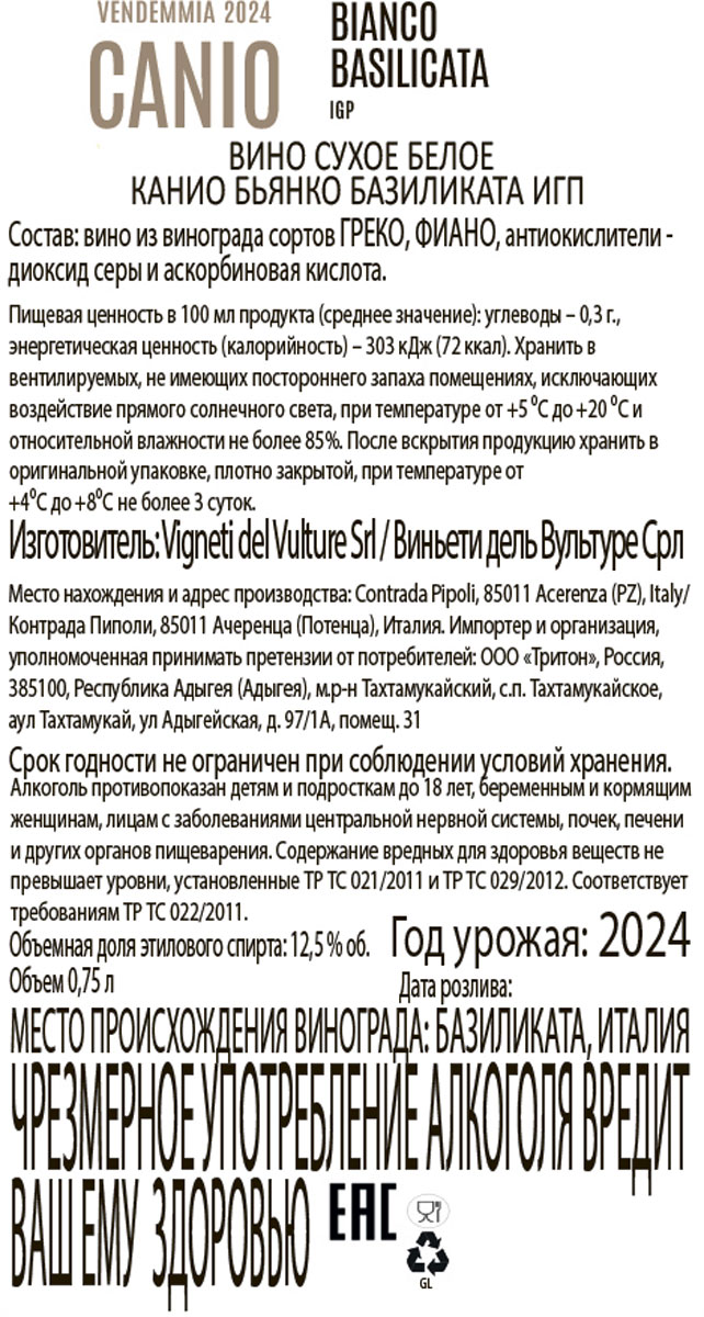 Вино Канио Бьянко Базиликата белое сухое 0,75 л