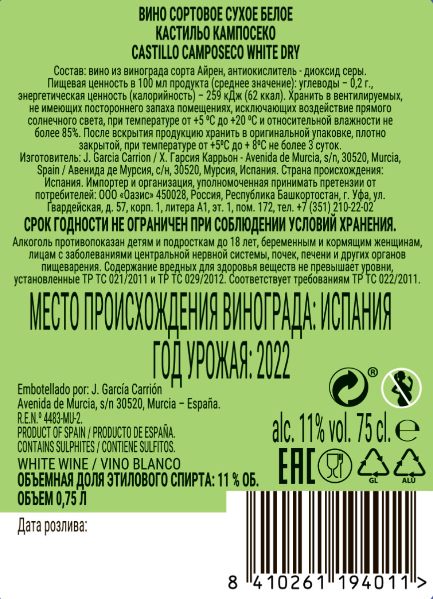 Почувствуйте свежесть морского бриза в каждой капле легкого, яркого, по-настоящему летнего белого вина «Кастильо Кампосеко»! Нежный светло-соломенный цвет, типичный для самого распространенного в Испании сорта винограда Айрен, яркие ароматы белых цветов, груши и зеленого яблока одинаково замечательно дополнят веселую вечеринку или семейную трапезу. Мягкий, сбалансированный вкус, с освежающей кислотностью и приятной «зеленой» ноткой в послевкусии прекрасно сочетается с легкими блюдами из рыбы и белого мяса, а также анчоусами и суши. Вина Кастильо Кампосеко — выражение исконных винодельческих традиций семьи Гарсия Каррьон, бережно хранимых и передаваемых из поколения в поколение вот уже более 130 лет. Рекомендуемая температура подачи: 8–10 °C.
