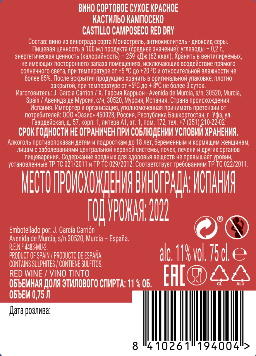 Вся энергия южного испанского солнца в каждой капле легкого, яркого, фруктового красного вина «Кастильо Кампосеко»! Блестящий рубиновый цвет с пурпурным оттенком, характерным для юного вина, а также интенсивные сортовые ароматы спелых красных фруктов, черных и красных ягод с нежным тоном солодки, присущие сорту Монастрель, станут идеальным дополнением к любому застолью, романтическому ужину или просто общению с друзьями и близкими. Округлый, сбалансированный вкус с хорошей кислотностью и приятным фруктовым послевкусием делает этот напиток универсальным сопровождением множества блюд, однако особенно хорошо это замечательное вино сочетается с красным мясом, ветчиной, сырами и итальянской пастой. Вина «Кастильо Кампосеко» — выражение исконных винодельческих традиций семьи Гарсия Каррьон, бережно хранимых и передаваемых из поколения в поколение вот уже более 130 лет. Рекомендуемая температура подачи: +14–16 °C.