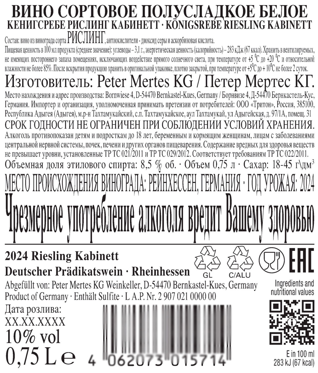 Вино Кенигсребе Рислинг Кабинетт белое полусладкое 0,75 л