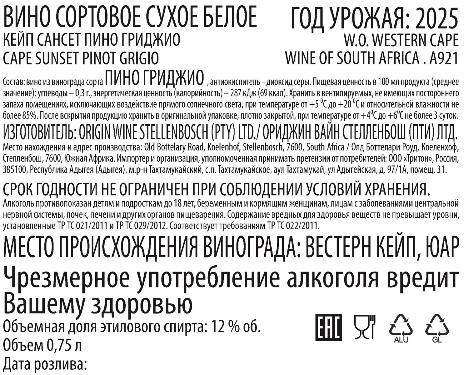 Вино Кейп Сансет Пино Гриджио белое сухое 0,75 л