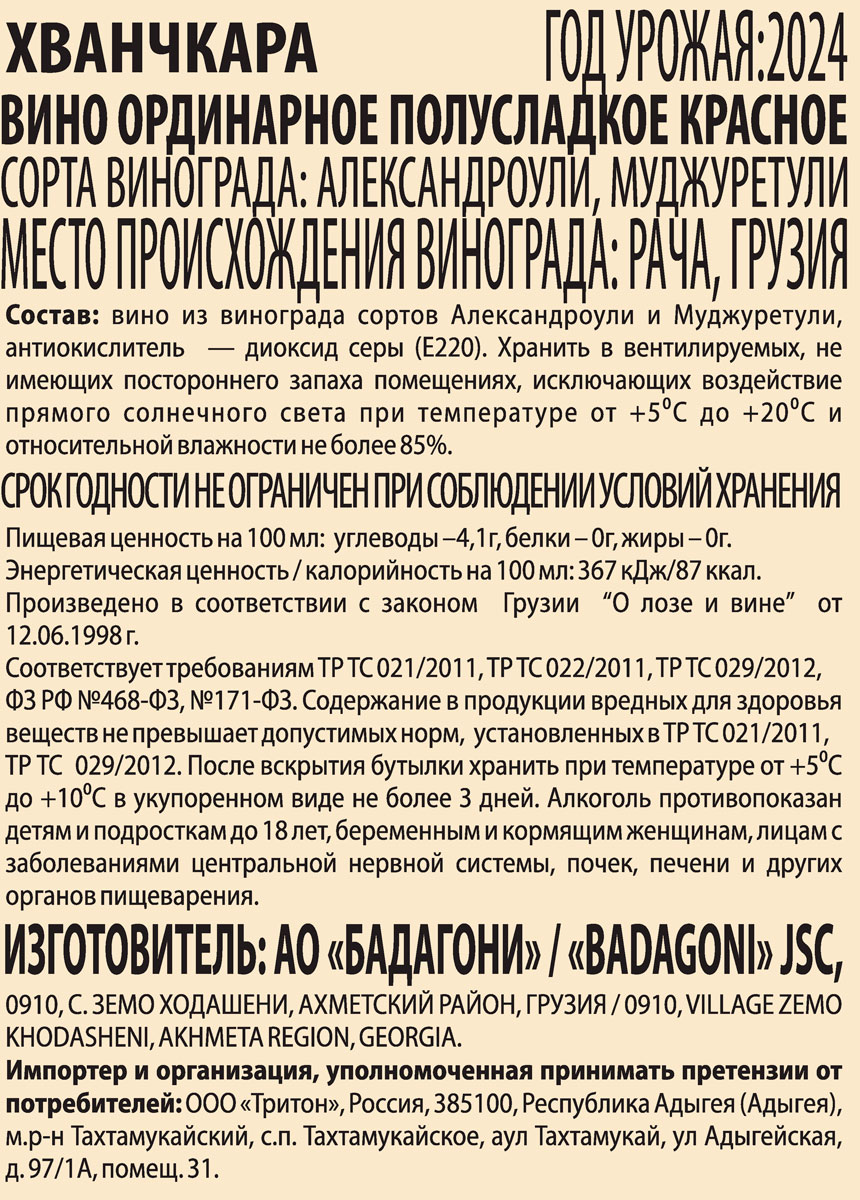 Это что угодно, но не хванчкара, возможно смыв баков или еще хуже. Первое что встречает это запах, точнее бадажная вонь, на стенках фужера никаких характерных "ножек", консистенция очень жидкая. Вкус...отвратительный! Привкус горечи, хорактерный для гипердешевых виноматериалов и явный спирт. Пить этот "badagoni хванчкара" нельзя!