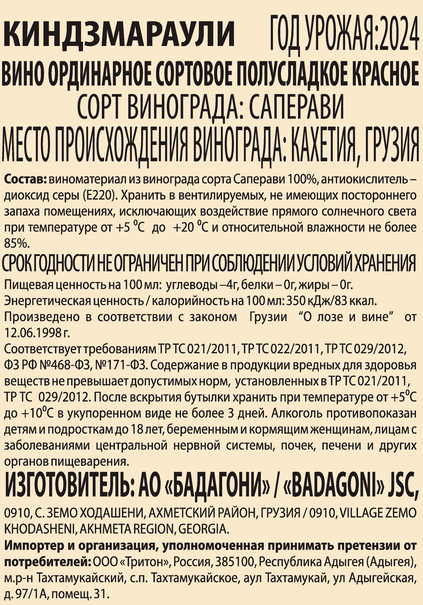 Вино Бадагони Киндзмараули красное полусладкое 0,75 л