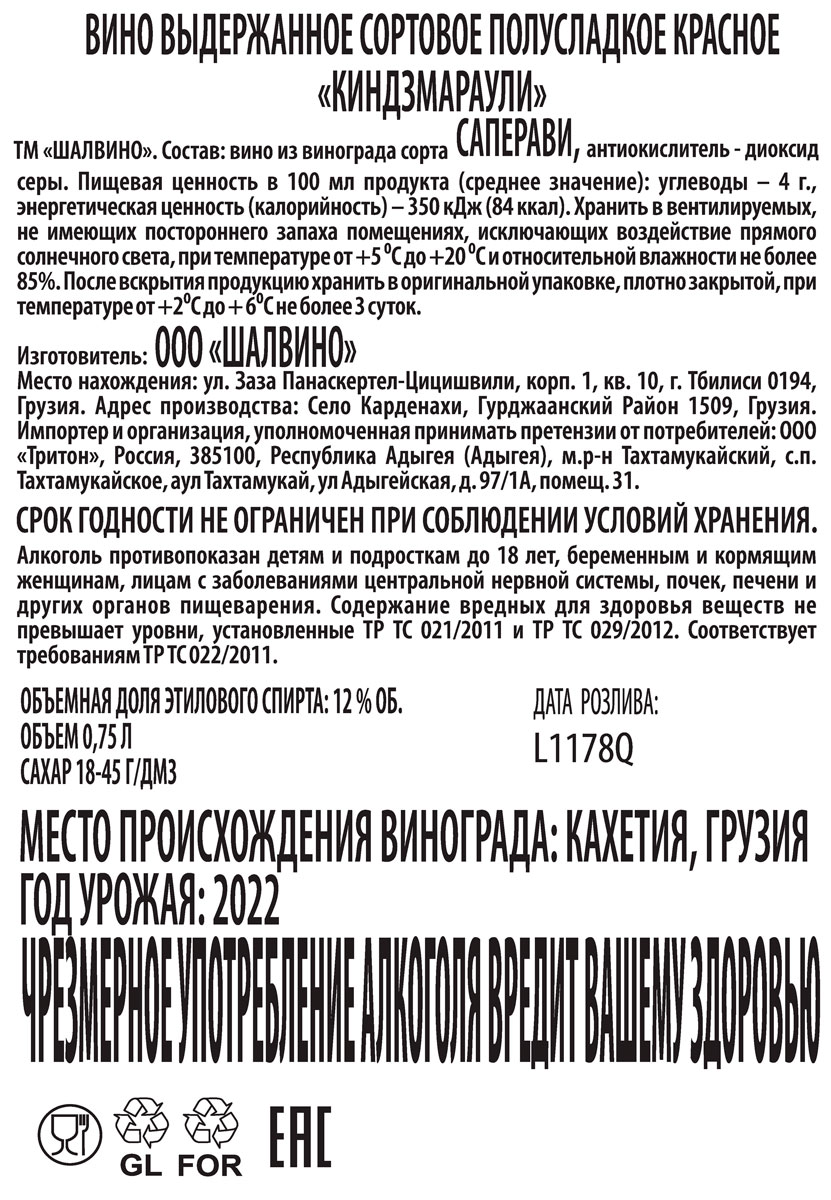 Вино Киндзмараули Шалвино красное полусладкое 0,75 л