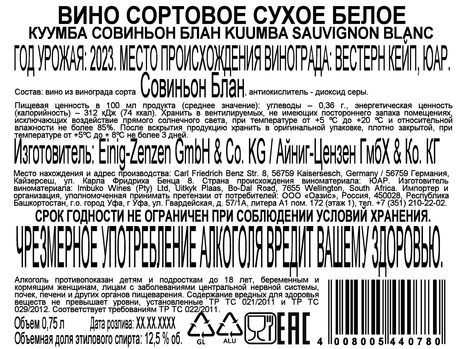 Вино Куумба Совиньон Блан белое сухое 0,75 л
