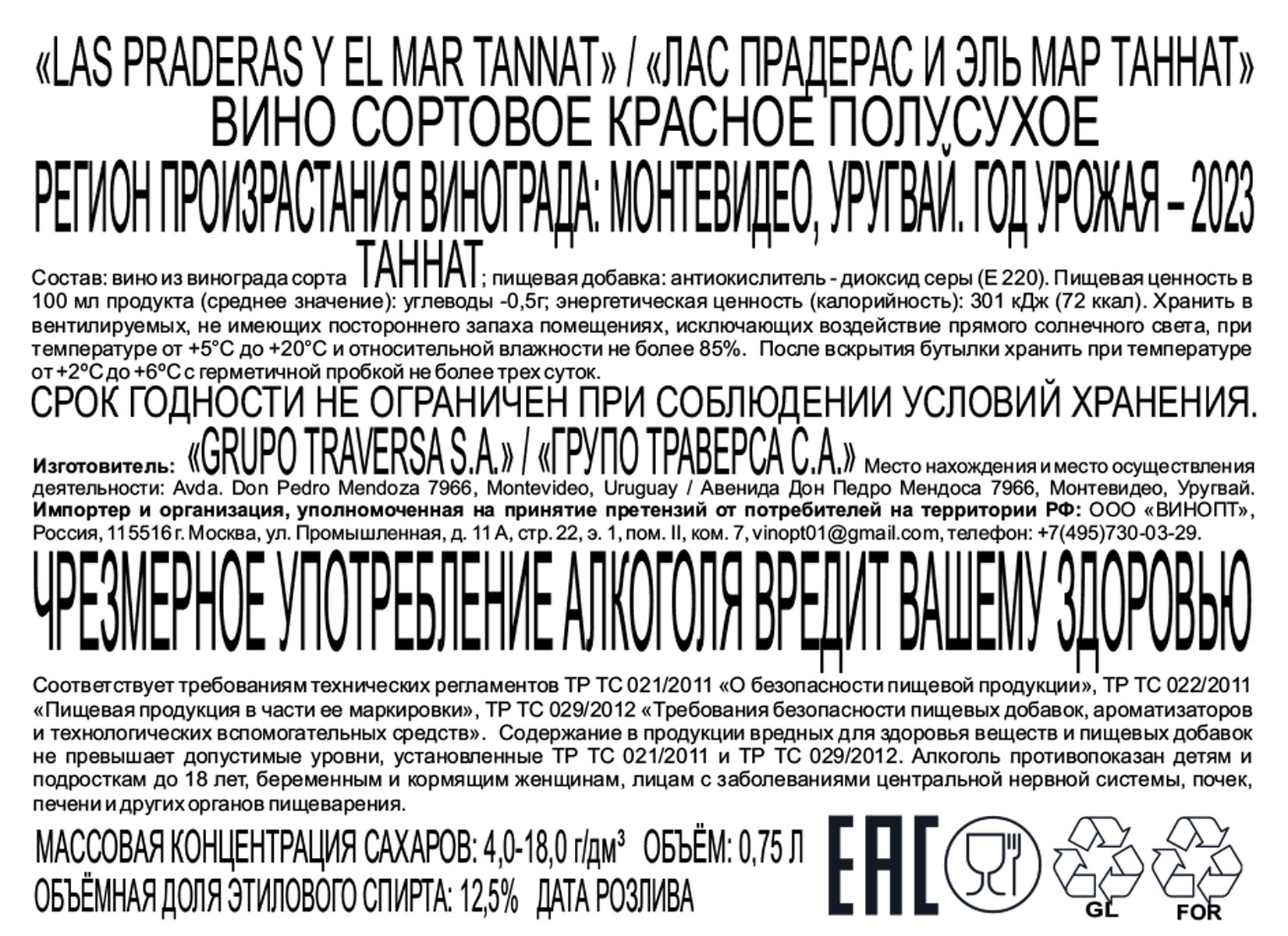 Вино Лас Прадерас и эль Мар Таннат красное полусухое 0,75 л