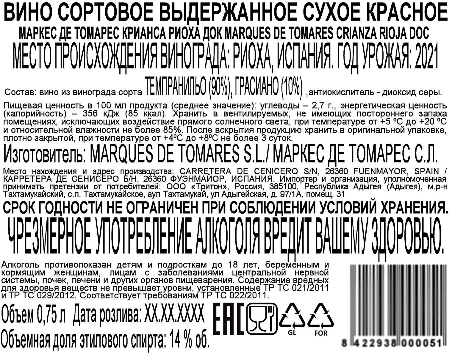 Вино Маркес де Томарес Крианца Риоха красное сухое 0,75 л