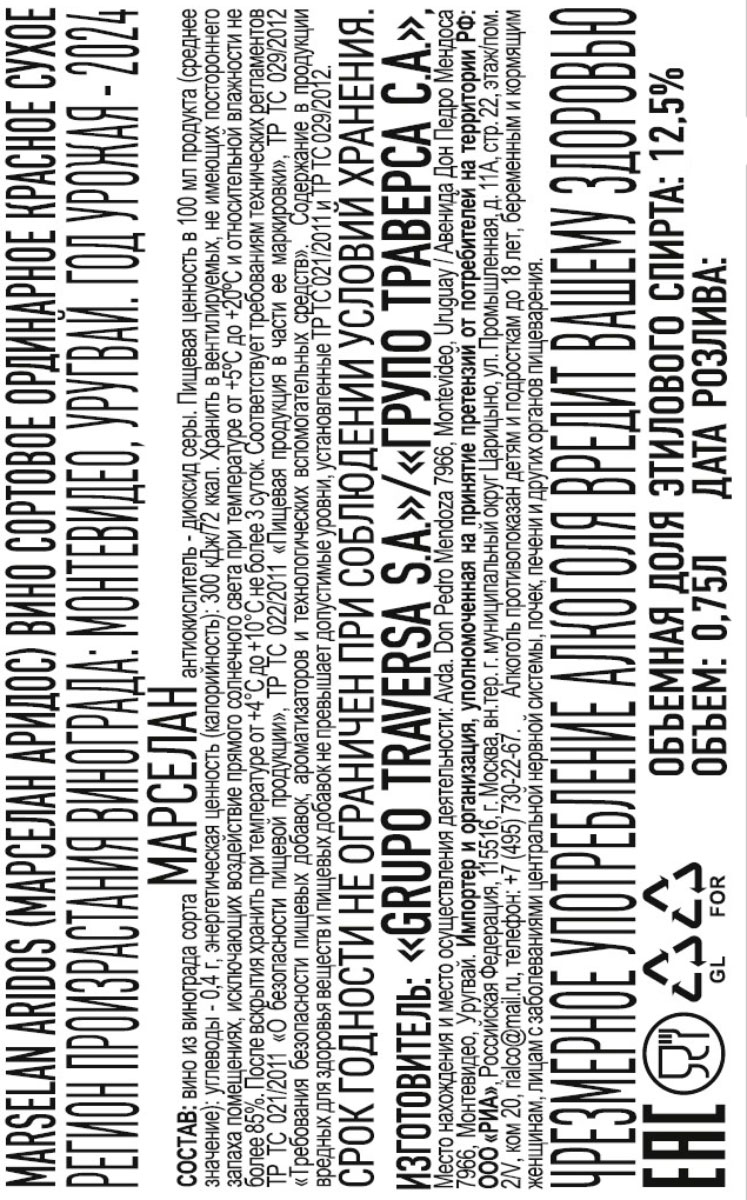Вино Марселан Аридос красное сухое 0,75 л