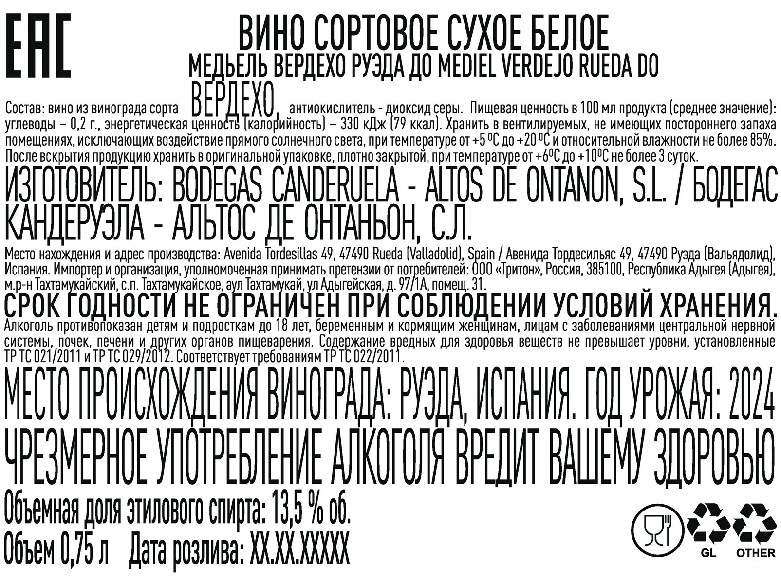 Вино Медьель Вердехо Руэда белое сухое 0,75 л