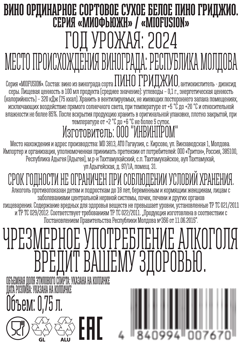 Вино Миофьюжн Пино Гриджио белое сухое