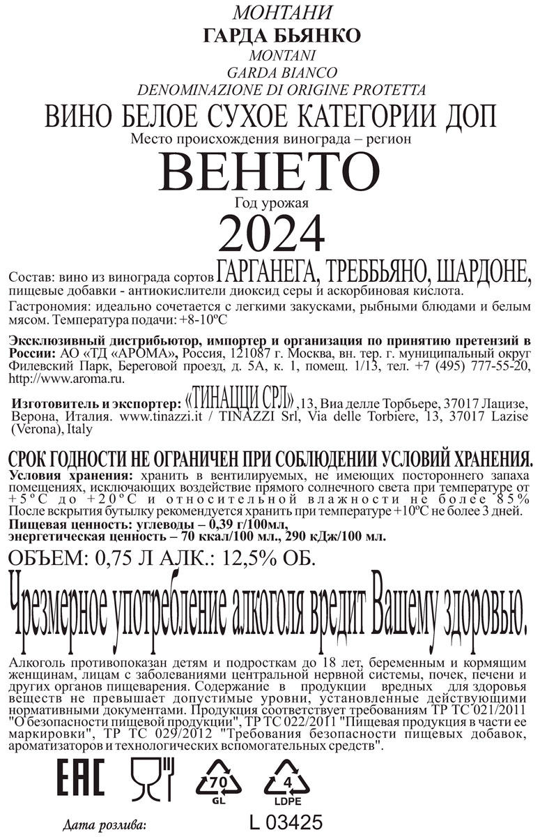 Вино Монтани Гарда Бьянко белое сухое 0,75 л