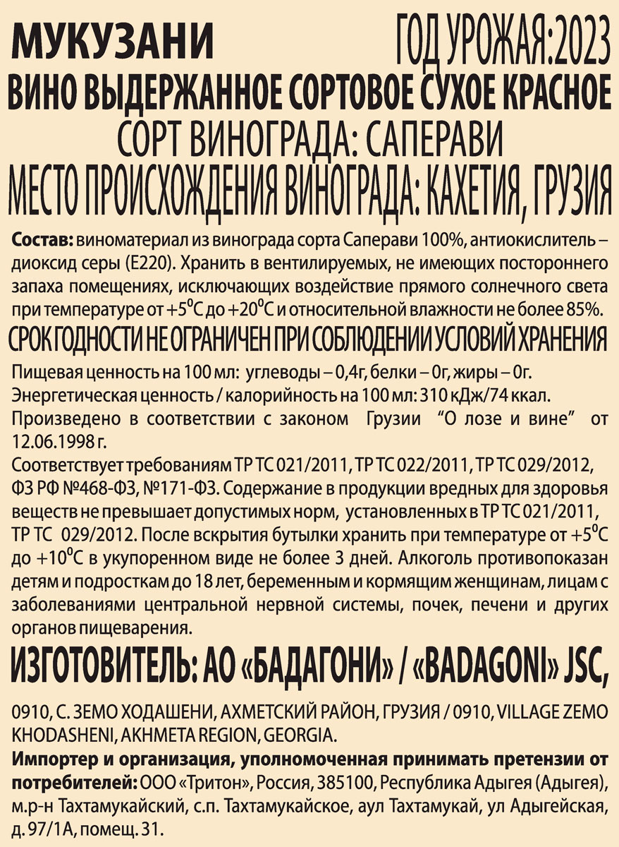 Вино Бадагони Мукузани красное сухое 0,75 л