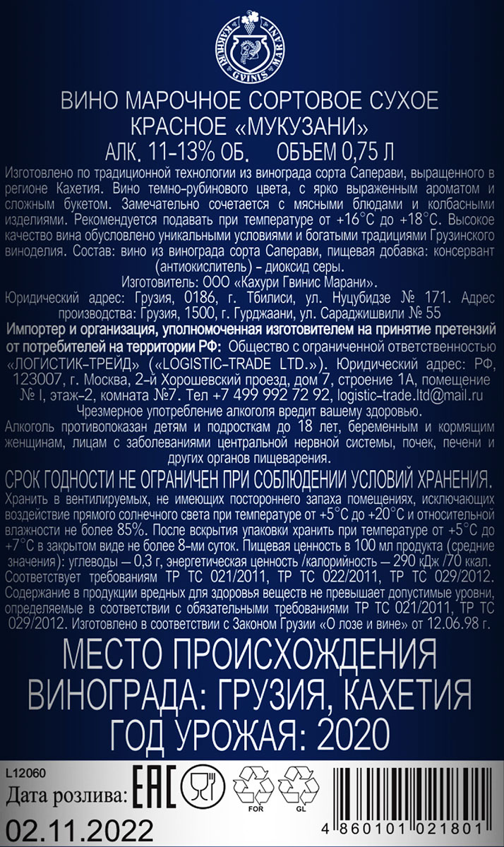 Вино Кахури Гвинис Марани Мукузани красное сухое 0,75 л