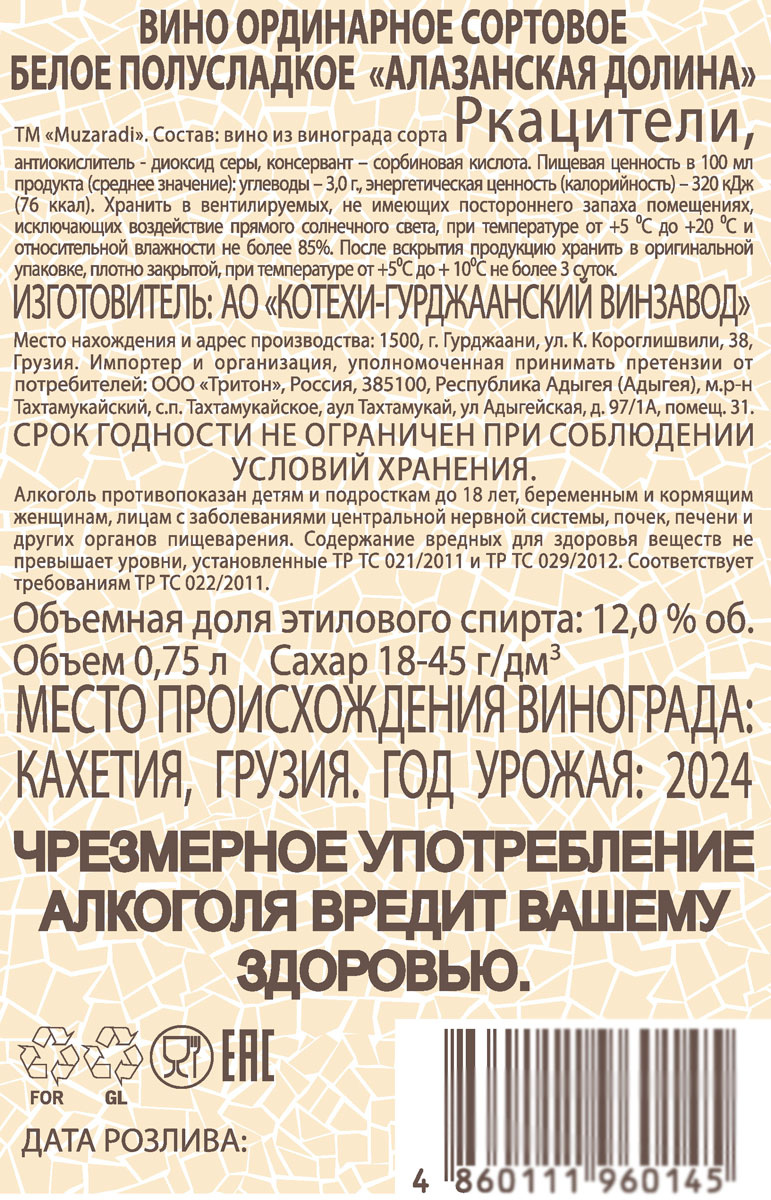 Вино Музаради Алазанская Долина белое полусладкое 0,75 л