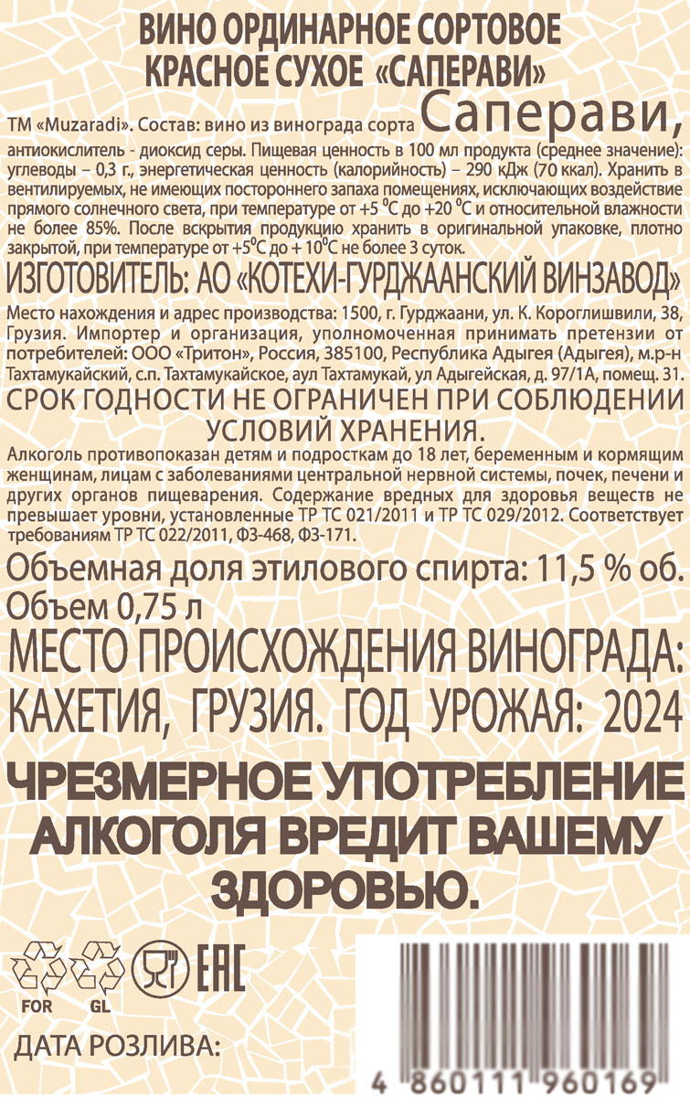 Вино Muzaradi Саперави красное сухое 0,75 л